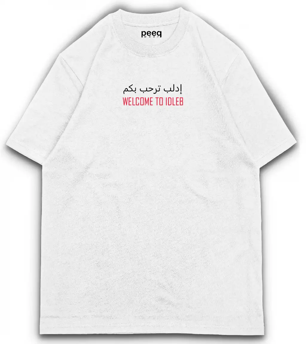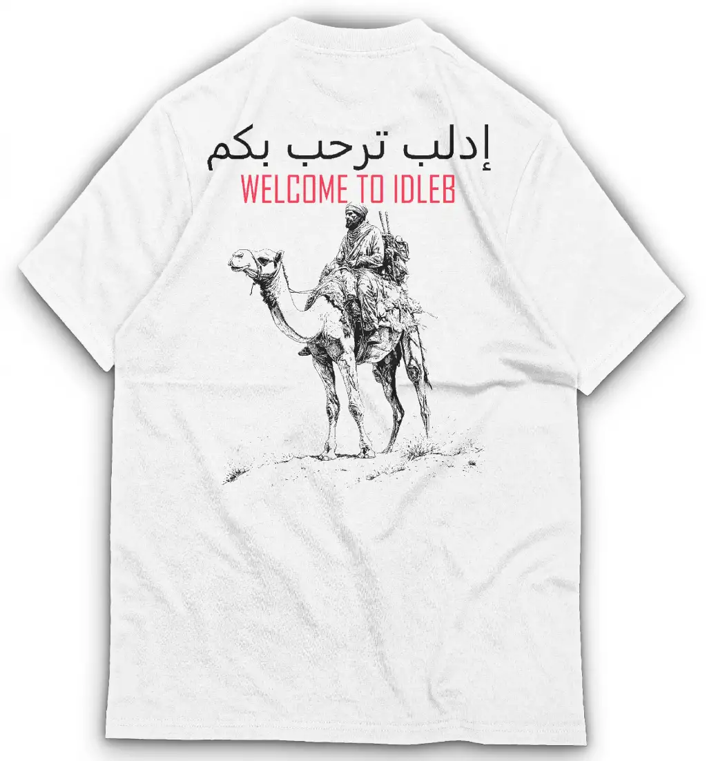 الرسم اليدوي على الظهر يصور رحلة الكفاح والعزّة، وكلمات "WELCOME TO IDLEB" ليست فقط ترحيبًا، بل موقفًا.